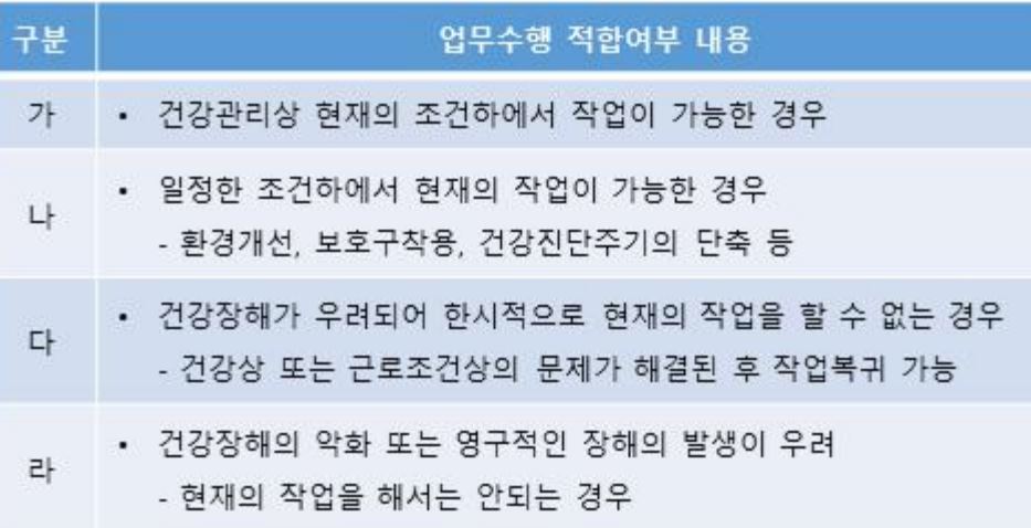 ▪ 건강 관리 구분, 업무수행 적합 여부 평가, 사후관리 조치 등