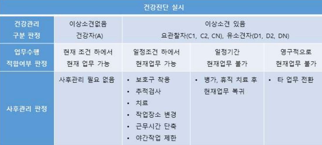 ▪ 건강 관리 구분, 업무수행 적합 여부 평가, 사후관리 조치 등
