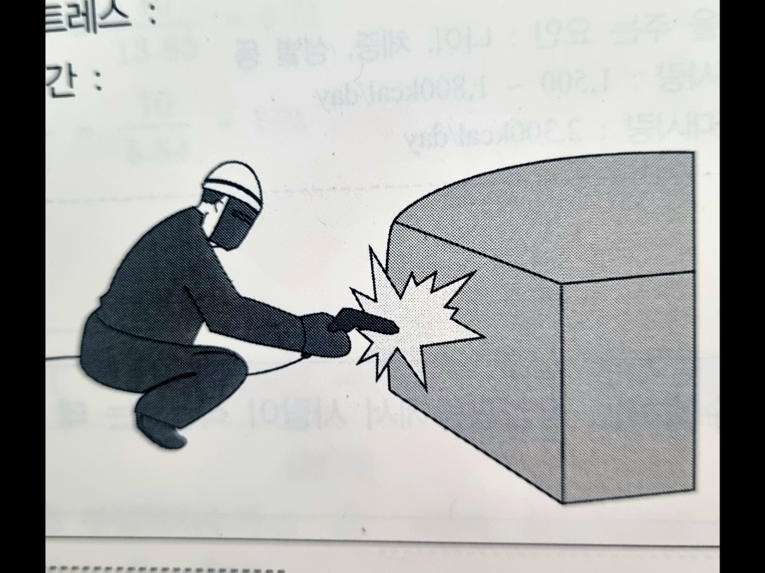 무릎을 구부리고 2시간 이상 용접작업을 시행할 때 유해요인을 아래와 같이 지적한 경우 각각의 대책을 1가지씩 기술하시오.