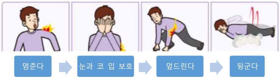 - 낮은 자세, 담요나 타올 물, 입과 코 막고 짧게 호흡