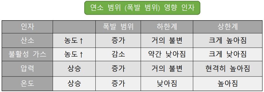 - 공기 중 가연성 가스 일정 범위 이내 함유 시 연소 가능