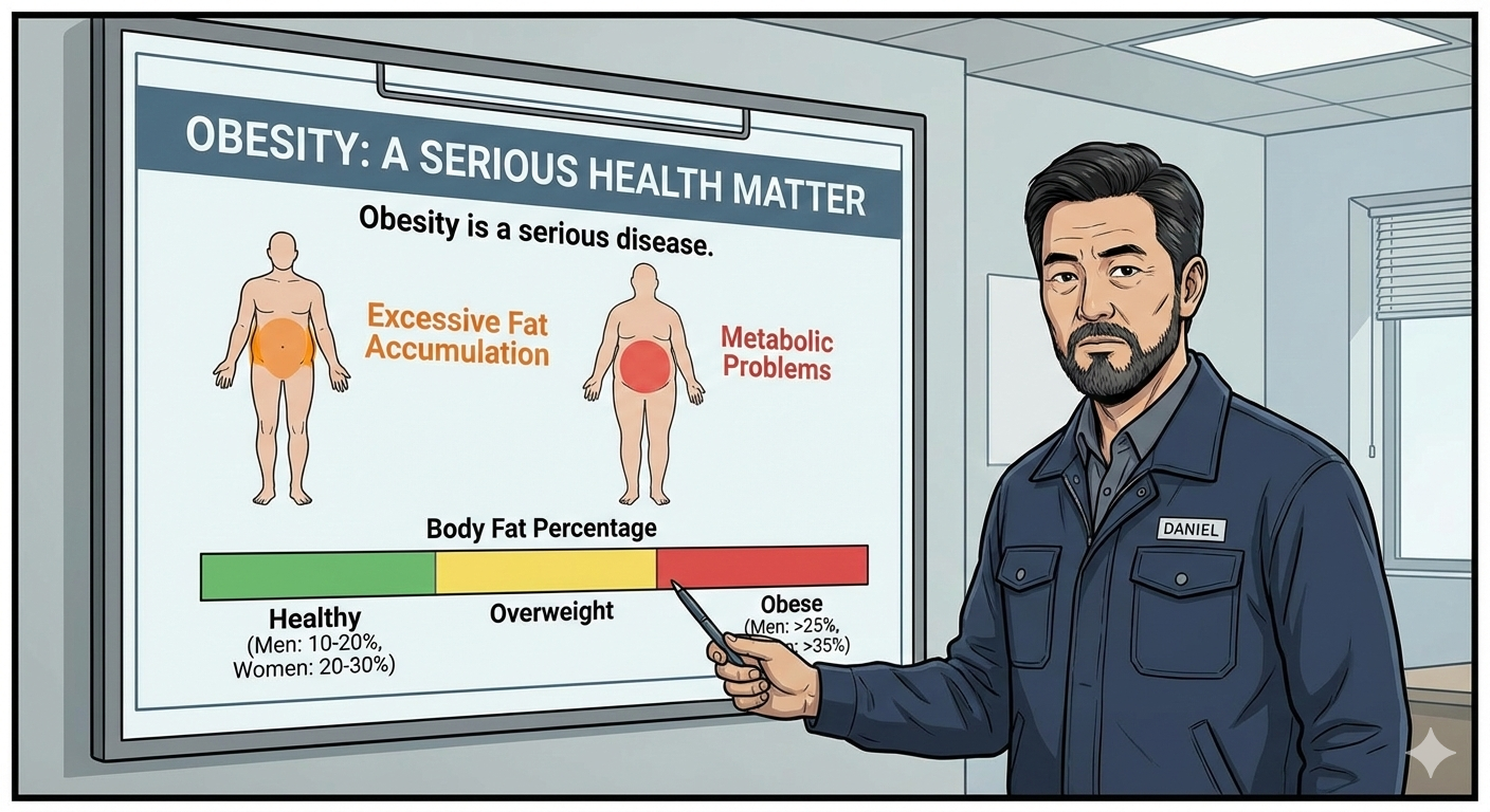 "현장에서 작업을 하다 보면 땀을 많이 흘리지만, 꾸준한 운동과 식단 관리를 하지 않으면 나이가 들수록 몸이 무거워지는 것을 느낍니다. 예전에는 단순히 '살쪘다'고 생각했는데, 산업안전기사로서 공부해보니 비만이 단순한 외모의 문제가 아니라는 것을 깨달았습니다. 오히려 우리의 건강과 안전을 직접적으로 위협하는 **'중요한 질병'**이라는 것이죠."