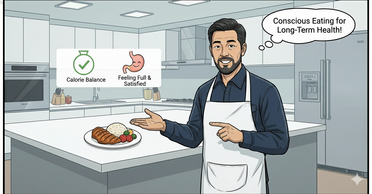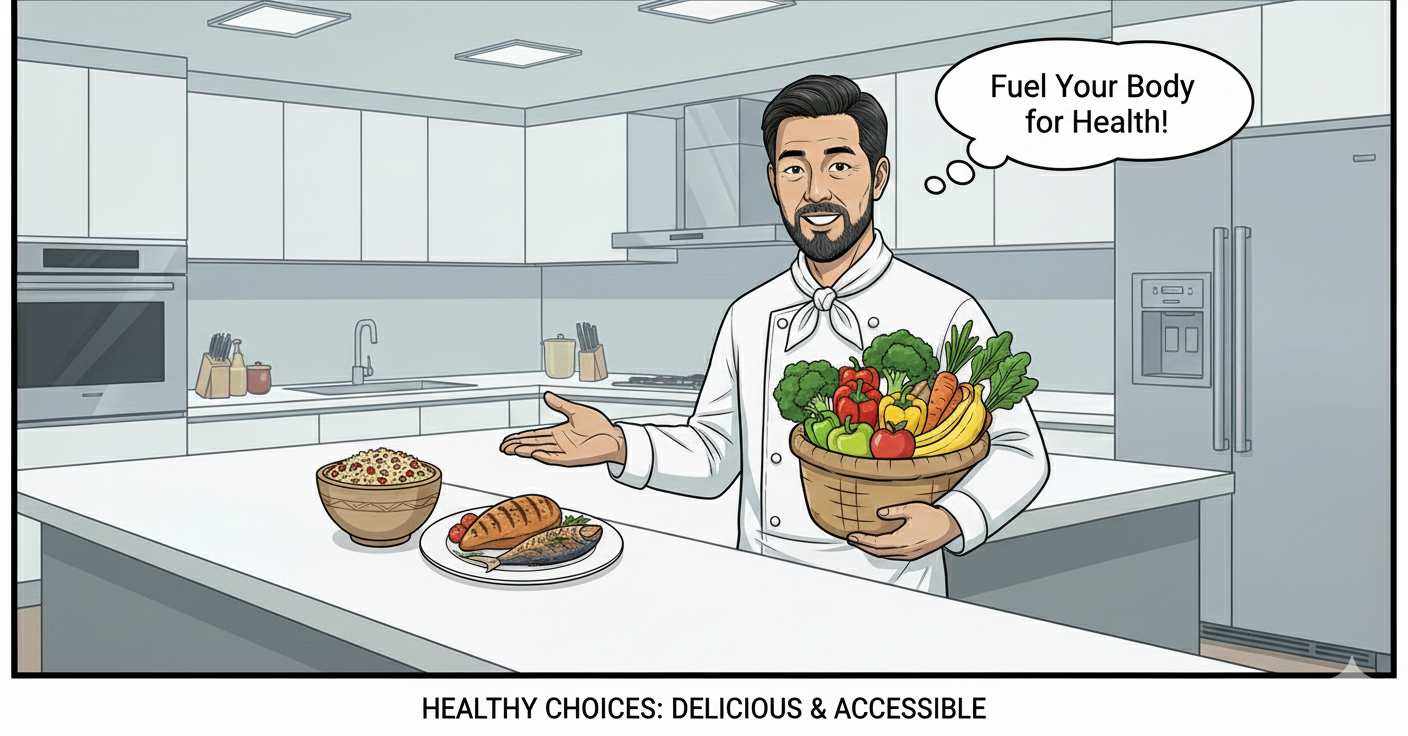 "몸이 무겁고 관절이 아프다고 운동만 맹목적으로 하는 것은 비효율적입니다. 우리의 몸은 우리가 먹는 것으로 만들어지죠. **'식이요법'**은 비만 관리의 절반 이상을 차지하는 가장 중요한 요소입니다. 저도 바쁜 현장에서도 규칙적인 식사를 하려고 노력하며, 무엇을 먹느냐가 몸의 활력에 큰 영향을 미친다는 것을 깨달았습니다."