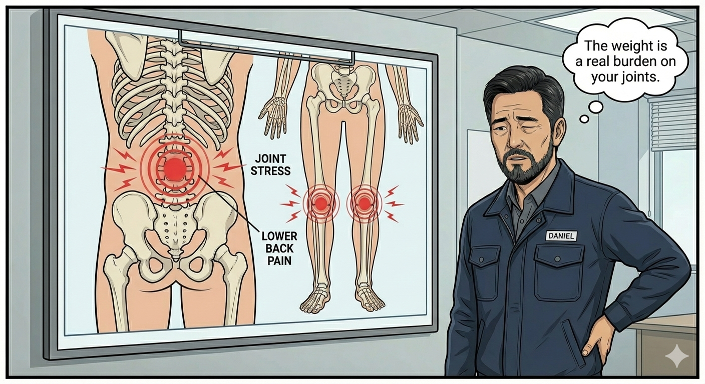 "조경 관리 현장에서 무거운 흙자루나 자재를 옮기다 보면, 허리와 무릎에 부담이 많이 갑니다. 그런데 몸이 무거워지면 이 부담이 훨씬 커집니다. 저는 산업안전기사로서 비만이 단순한 미용 문제가 아니라, 우리의 일상생활과 직결된 '근골격계질환'을 악화시키는 주요 원인이라는 것을 강하게 경고하고 싶습니다."