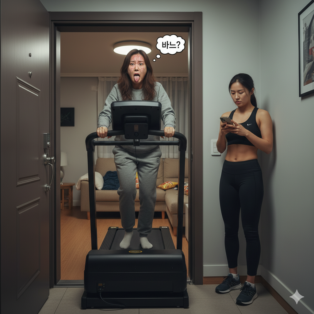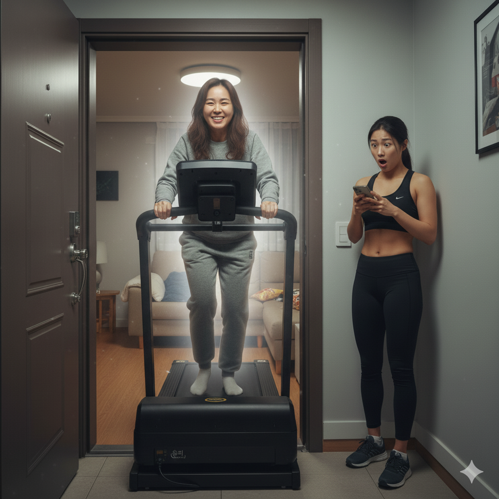김집순: (셀카 찍듯) 좋아. 나도 이제 '천국의 계단' 타는 뇨자! 자, 가보자고! (쿵쾅쿵쾅, 비장하게 발을 올린다. 2분 후.) 헉... 헉... 헉... 이걸 누가 천국이라고 지었어?! 지옥으로 가는 급행열차 아냐?! 겨우 5분인데 왜 에베레스트 정상 찍은 것 같지?! 내 허벅지... 아폴로 두 개 붙여놨나... 으악!!! 박강철! 야, 이거 환불 좀!!!
