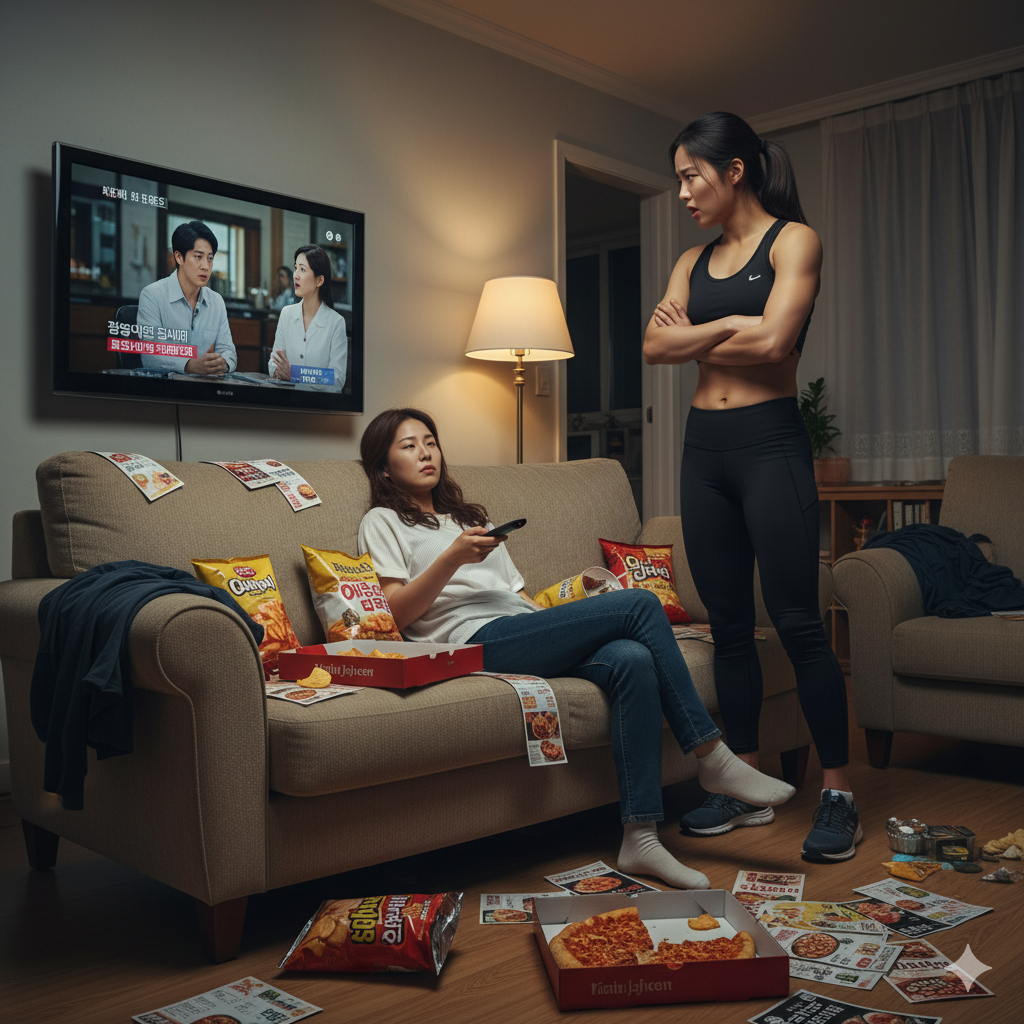 김태리: (팔짱을 끼며 등장) 언니! 드디어 왔어? 나의 야심찬 선물! '숀리 천국의 계단 스텝밀'! 이제부터 매일 30분씩이야. 도망가려고? 계단 못 걸으려고? (상자에서 조립된 기구를 꺼내 거실 한가운데에 놓는다. 소파가 밀려난다.) 소파랑 떨어지기 싫다고? 이제 소파는... 언니를 위해 희생해야 해.