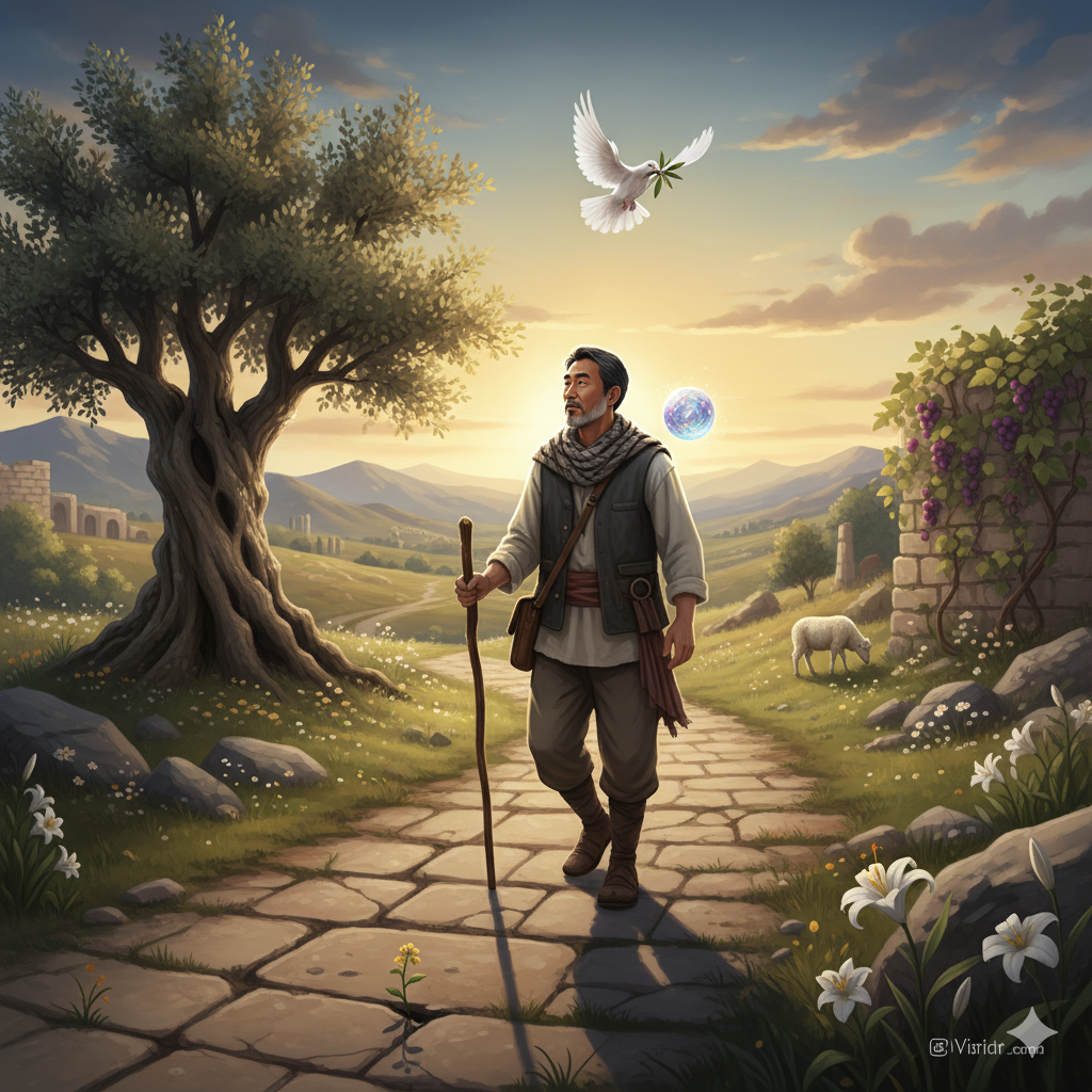 모습: 노아의 방주 비둘기가 물어온 감람나무 잎, 광야에서 백성을 먹인 만나, 시온 산에 핀 백합, 또는 예수님이 비유로 드신 겨자씨 한 알과 포도나무 등. 성경에 기록된 다양한 식물과 동물들이 바로 '초대자'입니다. 이들은 단순히 배경에 머무르지 않고, 저마다의 상징과 이야기, 그리고 영적인 의미를 품고 다니엘의 순례 여정 속에 '초대'되어 나타납니다. 그들의 모습은 자연의 섭리 안에 담긴 깊은 진리를 보여줍니다.