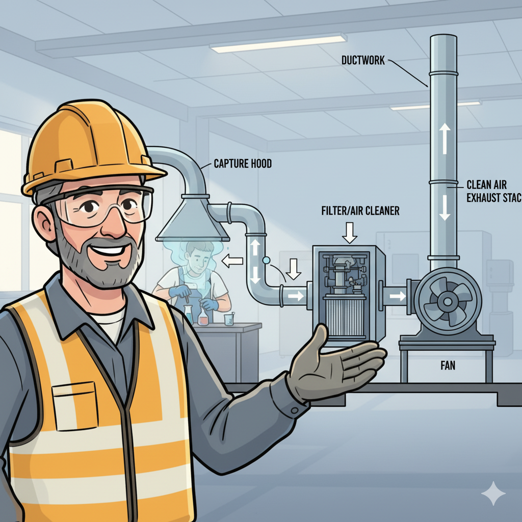 "유해물질이 발생하는 작업장은 마치 연기가 가득 찬 부엌과 같아요. 이때 우리는 환풍기를 켜서 냄새를 외부로 내보내죠? 작업장에서의 환기팬 역할을 하는 것이 바로 **'국소배기장치'**입니다! 하지만 주방 환풍기와는 차원이 다른, 정교한 과학이 숨어있어요."