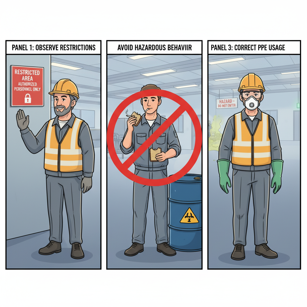 🚫 출입 금지 구역은 '넘지 말아야 할 선': 유해물질 취급 장소나 위험 지역은 경고 표지판, 안전 펜스 등으로 명확하게 구분되어 있어요. 이곳은 위험한 물질에 직접 노출될 수 있는 공간이니, 호기심이나 편의를 위해 절대 무단으로 출입해서는 안 됩니다. 심지어 오염을 다른 곳으로 확산시킬 위험도 있어요!