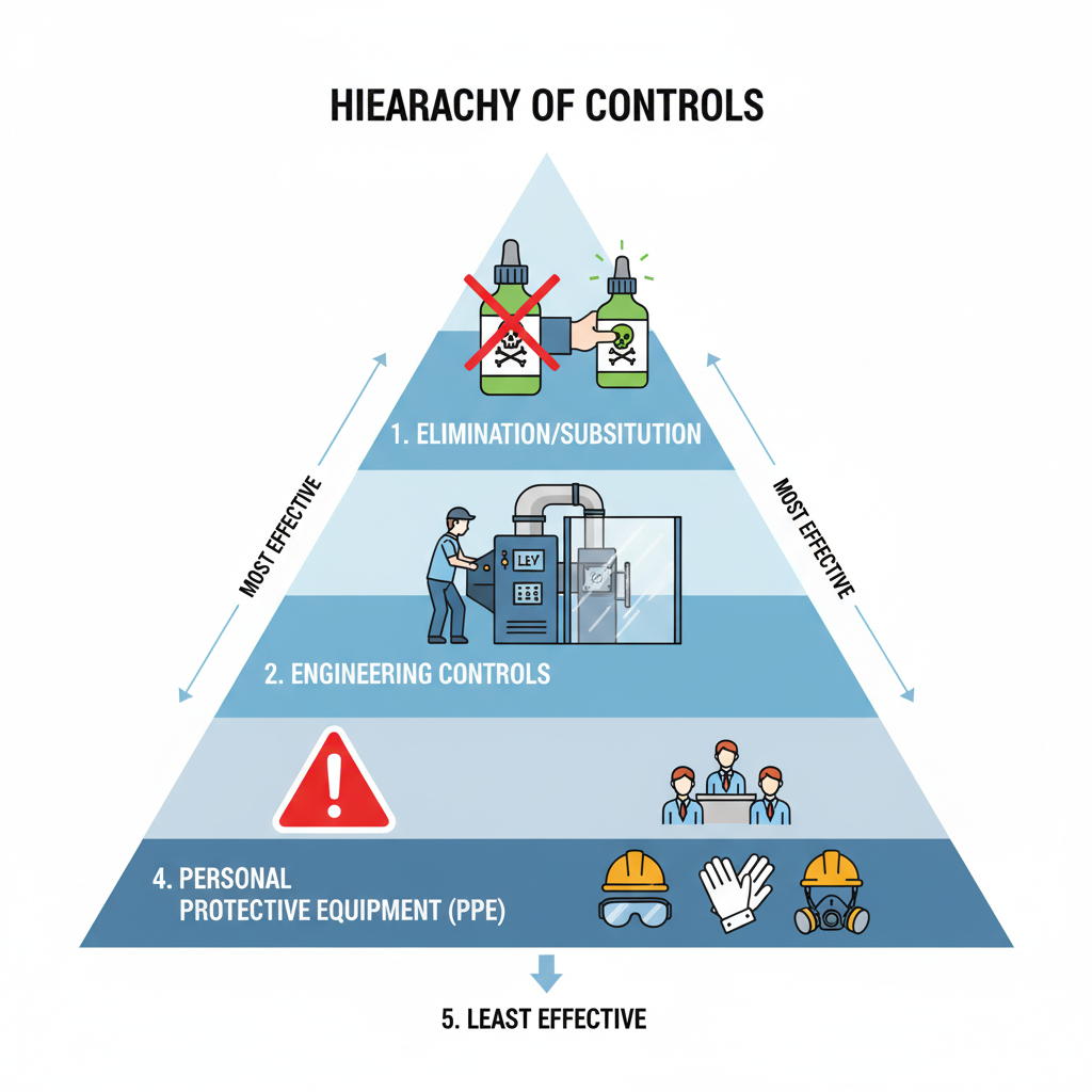 🗑️ 제거 (Elimination): 가장 좋은 방법은 해당 유해물질을 아예 사용하지 않는 것입니다. 예를 들어, 유해 성분이 포함된 오래된 세척액 대신, 고온 스팀 세척 등 완전히 다른 방법으로 대체하는 것을 고려할 수 있습니다.