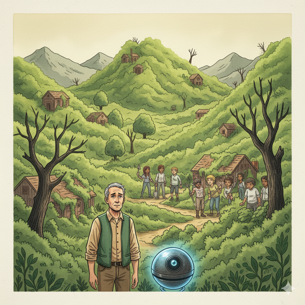Daniel alternated between Ergo's hologram and the kudzu vines. The phrase "All disasters are preventable" resonated deep within his heart. The folly of humans ignoring small warnings and seeking only easy solutions. But at the same time, in the kudzu vine's warning, he saw hope for finding wisdom for the future. He realized once again that to truly overcome disasters, one must seek and remove the root cause beyond the visible phenomena, and that the most important thing is 'the wisdom to prepare in advance.'