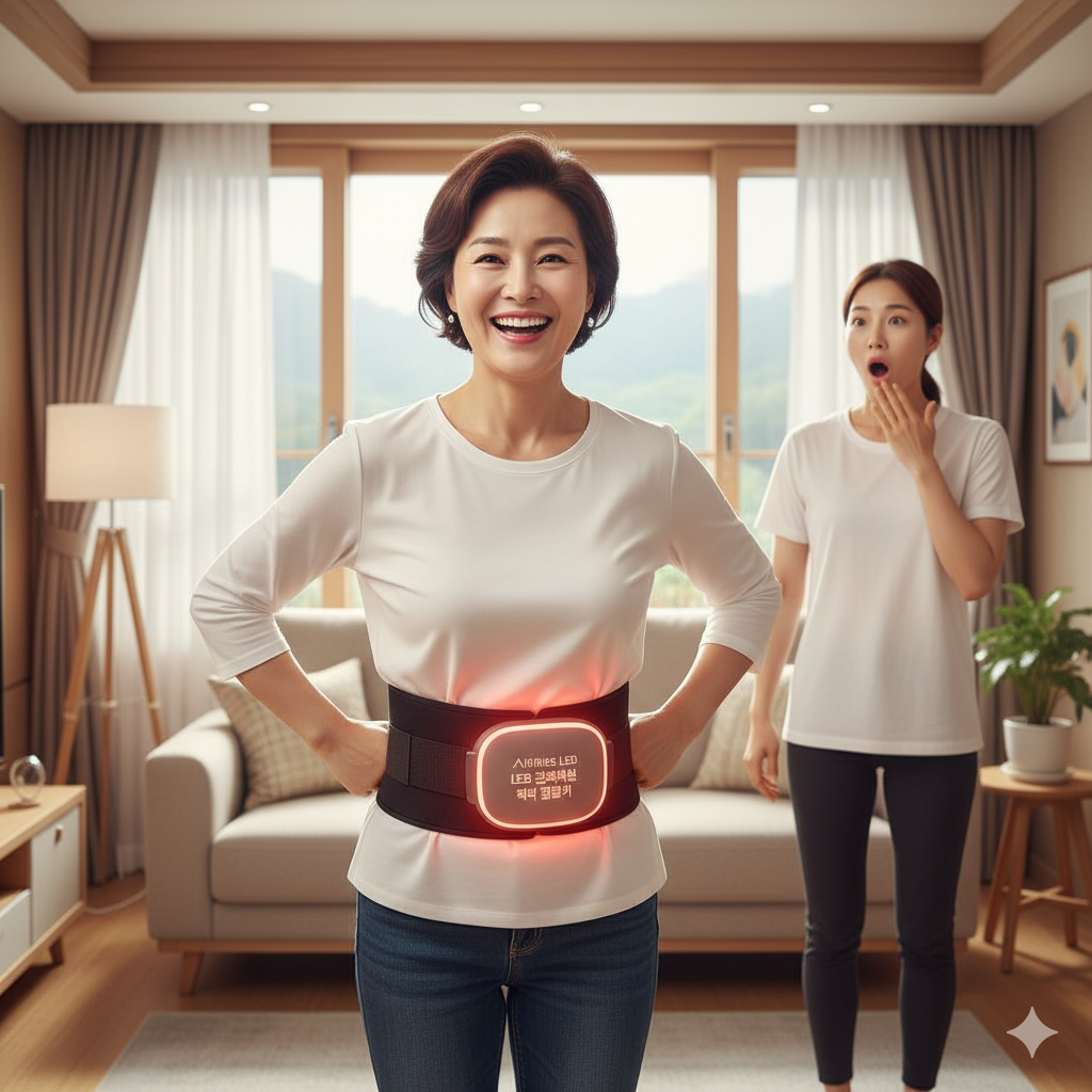 나레이션: 그렇게 김집순은 '시리어스 LED 프로 근적외선 허리 찜질기' 덕분에 '로봇 청소기' 신세에서 벗어나 '동네 요통 종결자'로 거듭났다. 그녀는 이제 허리 아파서 미루던 일들을 하나씩 처리하고 있으며, 동생 김태리도 언니의 허리띠를 탐내기 시작했다는 후문이다. 당신도 김집순처럼 지긋지긋한 허리 통증에서 해방되고 싶다면?