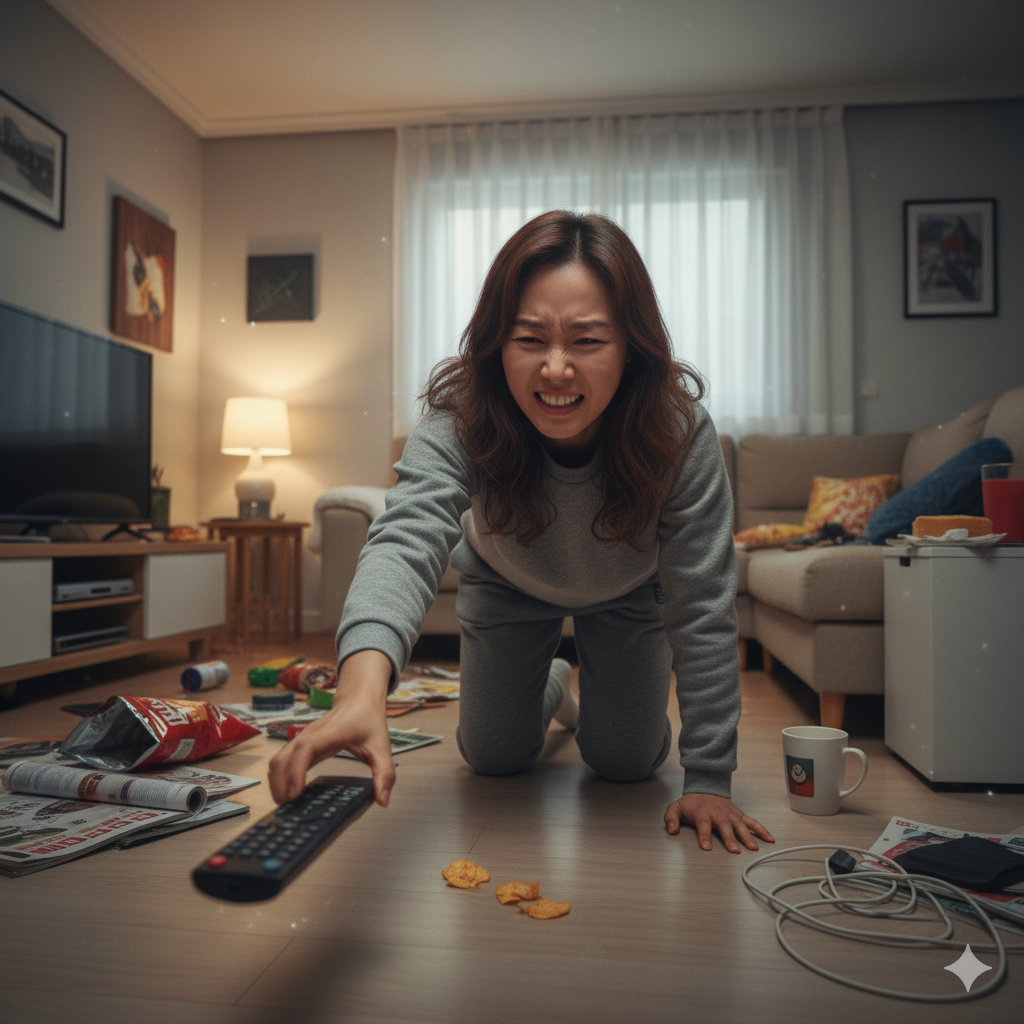 김집순: (낑낑거리며 리모컨을 향해 기어가며) 시끄럽다, 김태리! 내가 허리를 움직여야 사람이냐? 움직일수록 더 아픈데? 내가 로봇 청소기처럼 바닥을 훑어야 편하단 말이야! 너도 내 허리 돼봐라!