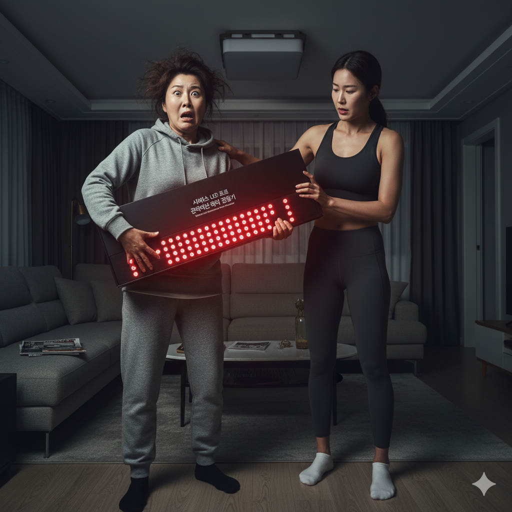 김태리: (한숨) 아 좀! 언니 생각하는 마음도 모르고! 이거 **'시리어스 LED 프로 근적외선 허리 찜질기'**라고! 근적외선이랑 원적외선으로 허리 심부까지 따뜻하게 지져(?)주는 최첨단 기기야! 게다가 온열에 마사지까지!