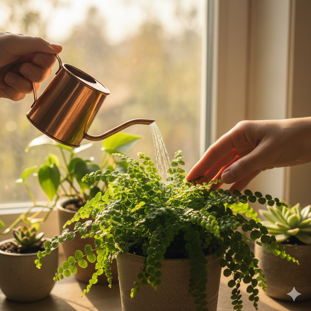 더피고사리는 흙이 너무 마르는 것을 정말 싫어해요. 흙 표면이 마르기 전에 이미 목마름을 느끼고 있을 거예요. 그래서 일주일에 한 번 정도, 또는 화분 겉흙이 살짝 말랐을 때 물을 흠뻑 주는 것을 추천합니다. 화분 밑으로 물이 시원하게 흘러나올 때까지 주고, 고인 물은 바로 버려 뿌리가 숨 쉴 공간을 확보해 주세요. 겨울철에는 성장이 잠시 멈추니 물 주는 횟수를 살짝 줄여주는 센스가 필요해요.