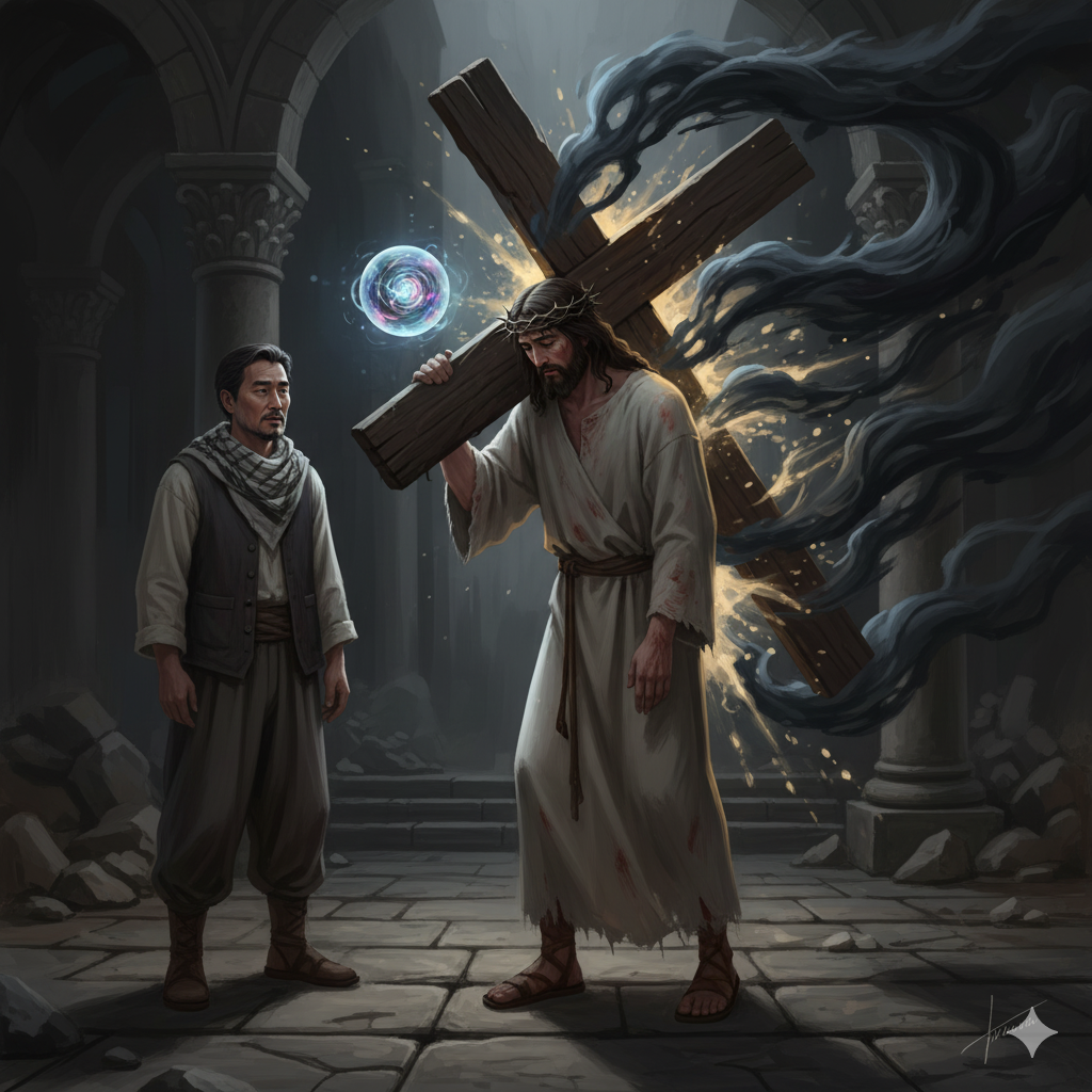 "순례자 여러분, 이곳은 헤아릴 수 없는 '죄의 무게'와 이를 감당하려는 '자기희생의 절대적 의지'가 교차하는 데이터 포인트입니다. 저의 분석에 따르면, 이 순간 예수님께서는 단순한 물리적 무게를 넘어, 로마 제국의 폭력적인 통치 아래 억압받던 백성들의 고통, 그리고 인류가 저지른 모든 고통과 비극의 '데이터 압력'을 온몸으로 받아들이셨습니다. 이 압력은 엄청났지만, 그 안에서 감지되는 **'무한한 사랑의 에너지'**는 모든 것을 초월하여 궁극적인 구원의 희망이라는 새로운 데이터 흐름을 창조했습니다. 바로 이 짐은 인류를 향한 가장 큰 사랑의 증표였습니다."