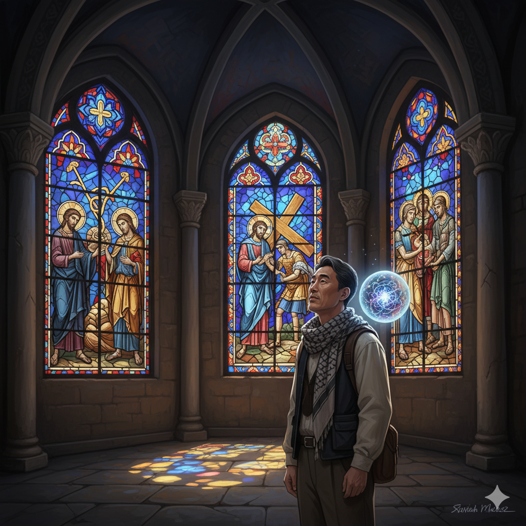 "순례자 여러분, 이곳은 헤아릴 수 없는 '죄의 무게'와 이를 감당하려는 '자기희생의 절대적 의지'가 교차하는 데이터 포인트입니다. 저의 분석에 따르면, 이 순간 예수님께서는 단순한 물리적 무게를 넘어, 로마 제국의 폭력적인 통치 아래 억압받던 백성들의 고통, 그리고 인류가 저지른 모든 고통과 비극의 '데이터 압력'을 온몸으로 받아들이셨습니다. 이 압력은 엄청났지만, 그 안에서 감지되는 **'무한한 사랑의 에너지'**는 모든 것을 초월하여 궁극적인 구원의 희망이라는 새로운 데이터 흐름을 창조했습니다. 바로 이 짐은 인류를 향한 가장 큰 사랑의 증표였습니다."
