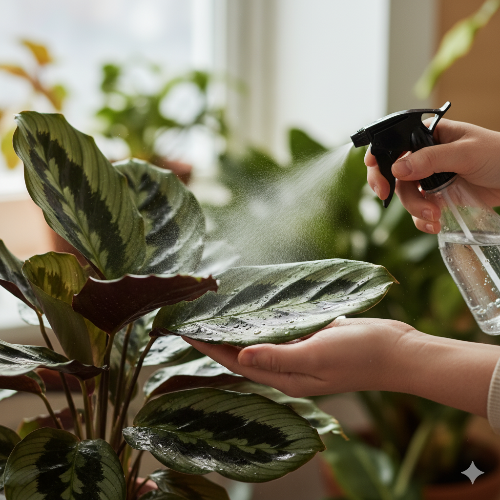 열대 식물답게 높은 습도를 아주 사랑해요! 실내가 너무 건조하면 잎 끝이 마르거나 오그라들고, 잎의 무늬가 선명하지 않을 수 있습니다. 잎에 주기적으로 미지근한 물을 분무해주거나, 가습기를 곁에 두어 60% 이상의 쾌적한 환경을 만들어주세요.