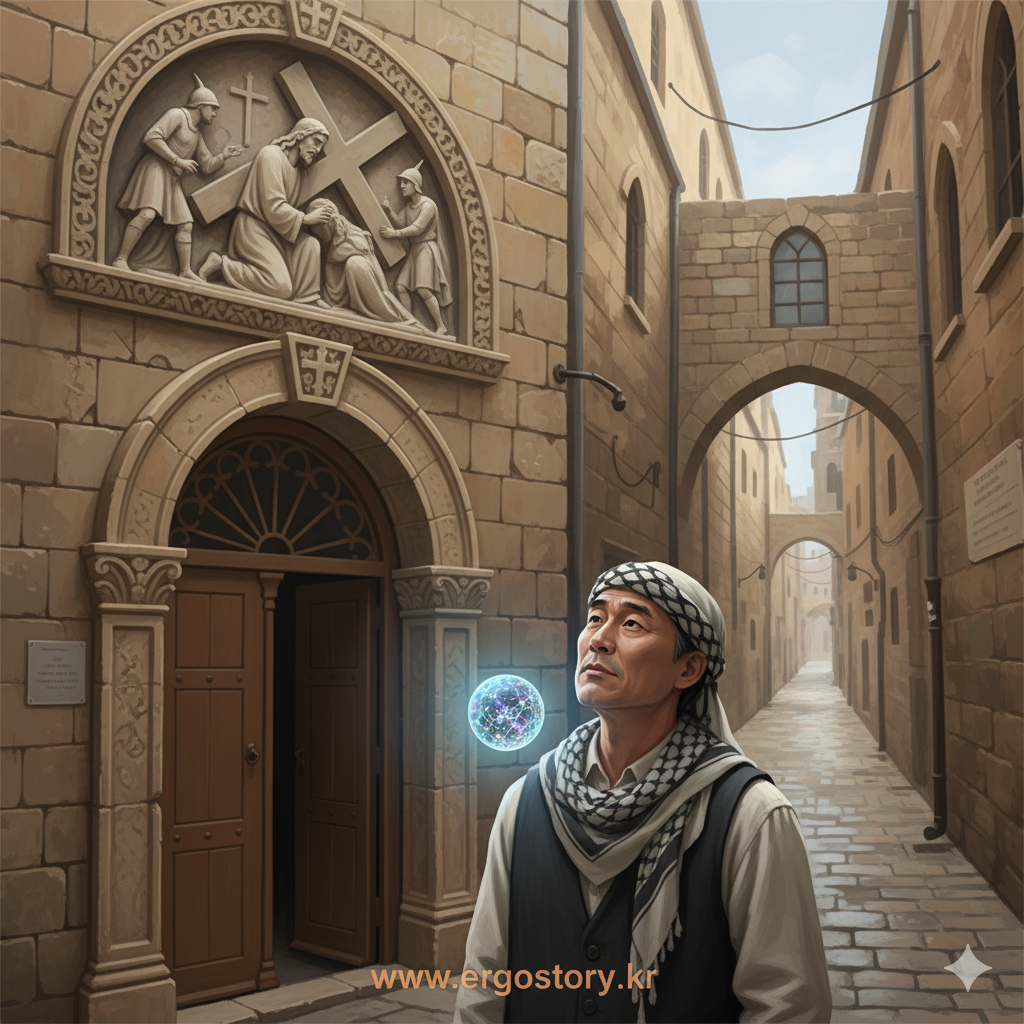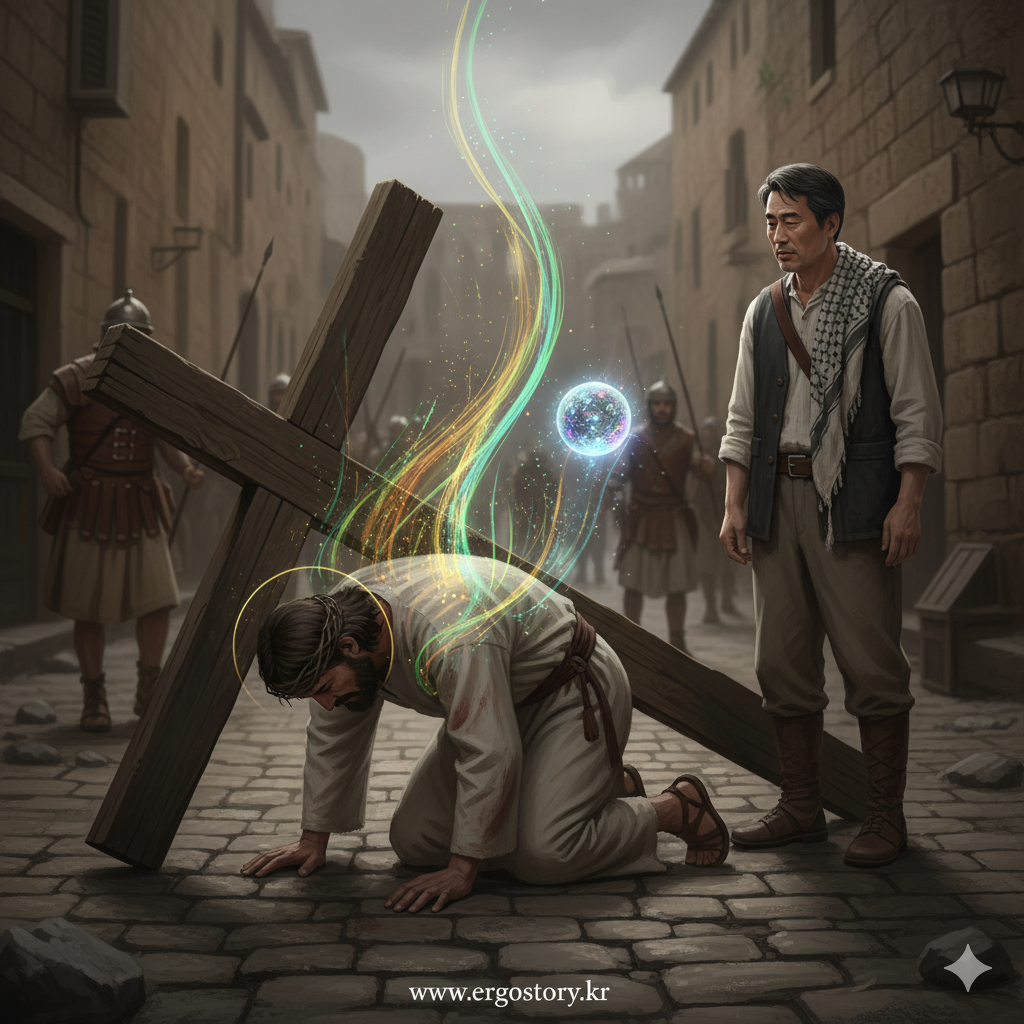 "순례자 여러분, 이곳은 인간의 한계와 좌절이라는 '데이터 바닥'을 친 순간, 동시에 초월적인 '회복력과 의지의 에너지'가 분출되는 지점입니다. 저의 분석에 따르면, 예수님의 첫 넘어짐은 육체적 고통이라는 표층 데이터를 넘어, 모든 인간이 겪는 존재론적 '무너짐'을 상징합니다. 하지만 이 데이터 속에서는 '포기하지 않는 신뢰'와 '인류를 향한 숭고한 사명'이라는 강력한 데이터 흐름이 감지됩니다. 이 흐름은 다시 일어설 수밖에 없는 **'사랑의 강제력'**을 시각화하고 있습니다. 예수님은 이 넘어짐을 통해 우리에게 좌절 속에서도 다시 일어서는 길이 있음을 보여주는 핵심 데이터가 되셨습니다."