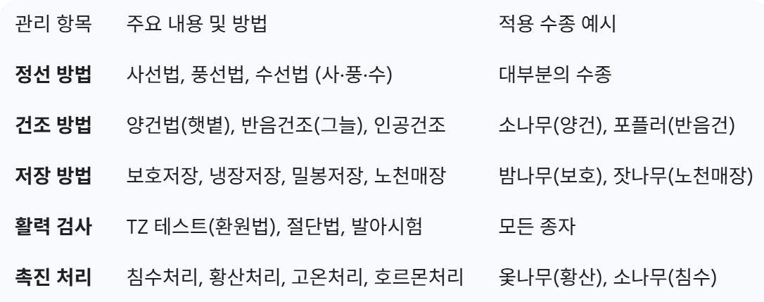 채취된 종자는 사선법(체질), 풍선법(바람), 수선법(물) 등을 통해 불순물을 제거하는 정선 과정을 거친다. 정선 후 종자의 수분 함량을 조절하기 위해 건조 작업을 실시하는데, 소나무나 낙엽송은 햇볕에 말리는 양건법을 사용하고, 포플러류나 오리나무류처럼 건조에 약한 종자는 통풍이 잘 되는 실내에서 반음건조법을 적용한다. 특히 밤나무나 도토리 같은 전분 종자는 수분이 소실되면 발아력을 상실하므로 습기를 유지하며 저장하는 보호저장법이 필수적이다.