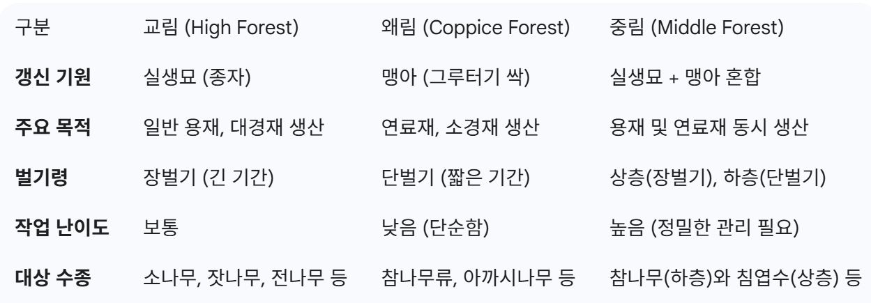 교림은 주로 종자에 의해 양성된 실생묘를 식재하거나 천연 하종을 통해 조성된 산림으로, 높은 수고를 가지며 대경재 생산을 목적으로 한다. 교림은 생물학적으로 성숙한 후 열매를 맺게 되며, 장벌기 경영을 통해 우수한 형질의 목재를 생산하는 데 적합하다. 반면 왜림은 벌채 후 남은 그루터기에서 발생하는 맹아를 이용하여 갱신하는 산림으로, 연료재나 소경재 생산을 위한 단벌기 경영에 유리하다. 왜림 작업 시 가장 중요한 요소는 벌채 시기인데, 왕성한 맹아 발아를 유도하기 위해 양분이 뿌리에 저장된 겨울부터 초봄 사이, 특히 참나무류 임분에서는 늦겨울에서 초봄에 벌채하는 것이 가장 효과적이다.