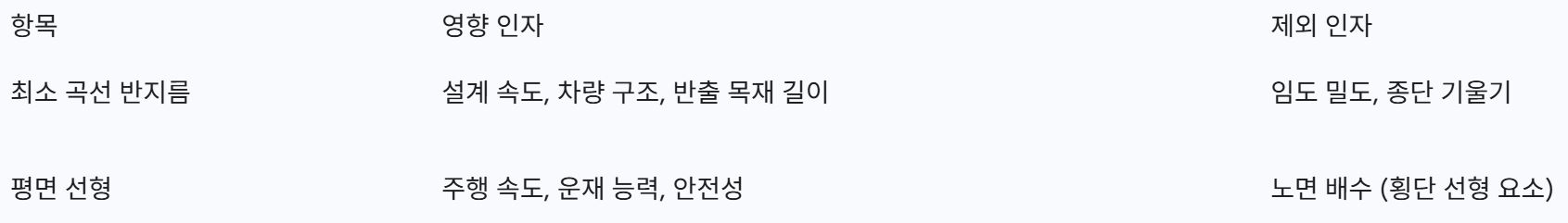 평면 곡선 설정 시 두 측선의 내각이 155º 이상으로 완만한 경우에는 곡선을 생략할 수 있다. 또한, 차량의 주행 안전을 위해 곡선부에는 외쪽기울기(편경사)를 설치하여 원심력에 대응하며, 이는 차량의 안전 운행을 돕는 결정적인 요소가 된다.