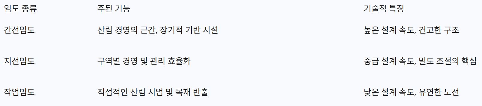 국내 산림 법령에 따른 임도의 기능별 분류는 크게 세 가지로 나뉜다. 첫째, 산림의 간선 역할을 하며 지역과 지역을 연결하거나 대면적 산림을 관리하는 간선임도이다. 둘째, 간선임도에서 분기하여 구체적인 경영 구역으로 진입하는 지선임도이다. 셋째, 실제 벌채나 조림 등 산림 작업의 직접적인 수행을 위해 설치되는 작업임도이다. 이러한 분류는 단순히 명칭의 차이가 아니라 설계 속도, 너비, 기울기 등 기술적 기준의 차등 적용을 의미하며, 이는 산림 관리의 위계질서를 확립하는 근거가 된다.