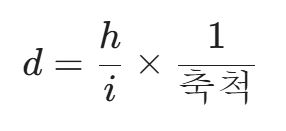 지형도에서 노선을 계획할 때, 종단 기울기(i)와 등고선 간격(h)을 알면 양각기 폭(도상 거리 d)을 결정할 수 있다.