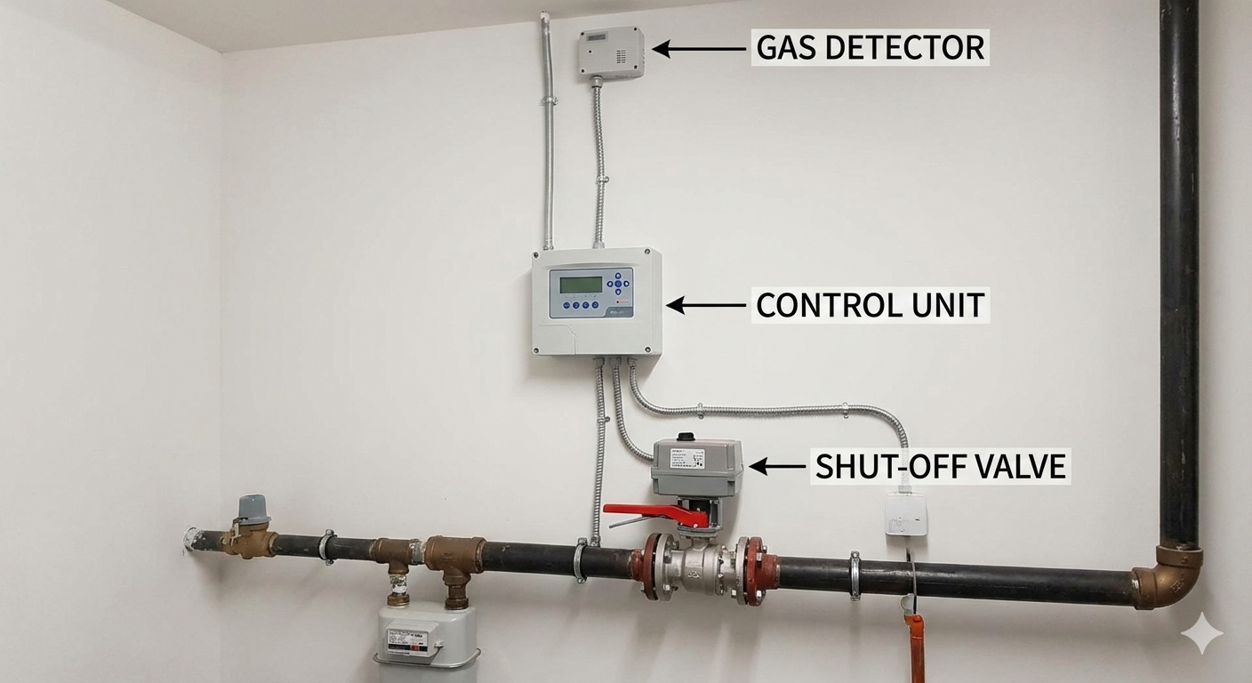 가스누출자동차단장치는 검지부, 제어부, 차단부로 이루어져 있다.