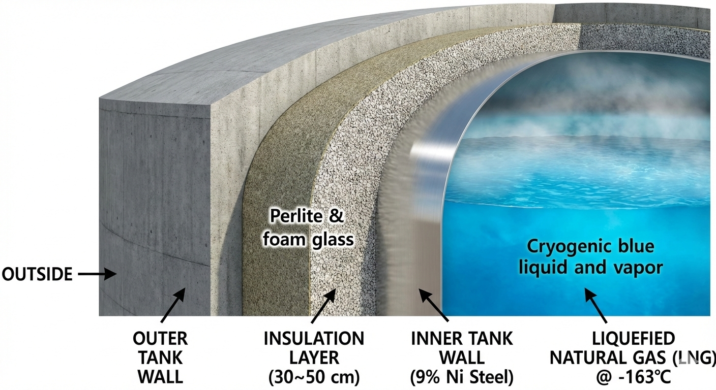 외부 ← 탱크 외벽 - 보온재층(30~50 cm) - 탱크 내벽 → 액화천연가스(-163℃)