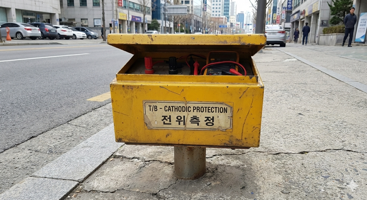 전위측정용 터미널박스(T/B, Terminal Box)는 도시가스 매설배관의 전기방식 효과를 확인하기 위해 도로변에 설치하는 장치입니다. 배관의 **전위(전위차)**를 측정하여 전기방식이 적절하게 이루어지고 있는지 점검하는 데 사용됩니다.
