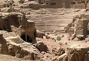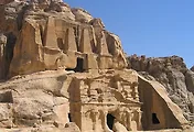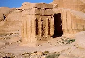 Grandest of all, and unique in its style, is a niche carved into a natural outcrop beside a stretch of paved road. 모두의 웅장한 스타일과 독특한 틈새 자연의 노출로 포장 도로의 스트레칭 옆에 새겨져있습니다. It is easily missed on the way into Petra for the carved façade seems to have been designed for those leaving the city. 그것은 쉽게 길을 페트라에 새겨진 벽면을 놓쳤다는 그 도시를 떠날 위해 고안되었을 것으로 보인다. Two god-blocks stand side by side within an architectural frame of pilasters and architrave crowned by a Doric frieze. 두 신을 블록 옆에 pilasters의 건축과 측면 프레임 내에 서 도리스 지방의 프리즈에 의해 선정 엔태블러처의 최하부. While the smaller god-block is plain, the larger deity stares disconcertingly at passers-by out of square eyes set on either side of a strip of a nose; it is believed to date from the reign of Malichus II in the mid-first century AD. 그러나 하나님의 작은 블록 분명하다, 지나가는 disconcertingly에서 큰 신성을 쳐다보고 아웃 평방 눈 코 스트립의 양쪽에 설정에 의해, 그것을 날짜 중반에 최초로 세기 Malichus II의 통치에서 믿고있습니다 광고.